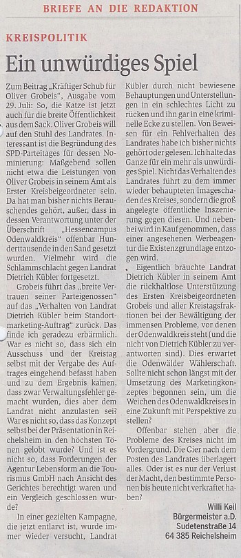 Insbesondere aus den Reihen des bisherigen Koalitionspartners der Kreis-ÜWG, der SPD, aber auch von den Grünen und der FDP kamen in regelmäßigen Abständen im Zusammenhang mit der Auftragsvergabe des Standortmarketingkonzeptes für den Odenwaldkreis sehr persönliche Angriffe, die sogar in Rücktrittsforderungen mündeten. So wurde ihm u.a. unterstellt, er habe bei der Auftragsvergabe an die Agentur Lebensform persönliche Vorteile gezogen. Die Folge waren Vernehmungen sowie Durchsuchungen von Büro- und Wohnräumen sowohl im Landratsamt als auch in der Hüttenthaler Privatwohnung Küblers, was für die Familie enorm belastend war. Dass Dietrich Kübler über jeden Verdacht erhaben ist, liegt auf der Hand. Jetzt gehen immer wieder neue anonyme Anzeigen bei der Staatsanwaltschaft ein, die wiederum geprüft werden müssen. So wird das Ganze am Köcheln gehalten. Im März kommenden Jahres ist schließlich Landratswahl ...